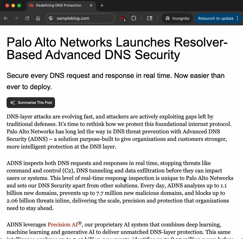 Embed a "Summarize" button on any page that users can click to summarize the page content with AI. Since it starts as a chat, they can ask follow-up questions, and the AI will cite your content to answer them.